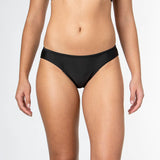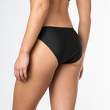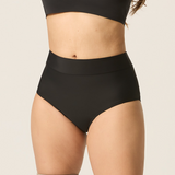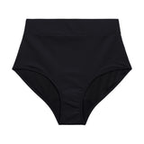 Swim Bikini Brief Hi-Waist Black  (sizes 10-20): These fabulous full-coverage bikini briefs, have a retro feel and are made from an innovative NEW recycled fabric which is chlorine-resistant and UV50+ rated. The hi-waist style has a high-rise waist, thick supportive waistband and fast-drying absorbent lining. Holding up to 10ml (2 teaspoons/ 2 tampons) they are flattering and functional.